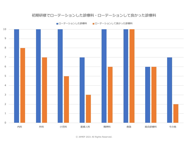 西﨑 早速始めていきたいと思います。1つ目の質問は【ローテーションした診療科・ローテーションして良かった診療科】(グラフ参照)についてです。
