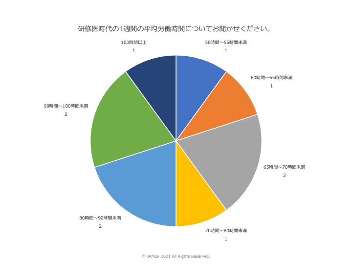 西﨑 それでは次の話題に移ります。次は「研修医時代の一週間の平均時間外労働時間についてお聞かせください」というものです。これは回答結果にかなりバラつきがありましたので、まず円グラフを共有したいと思います(グラフ参照)。